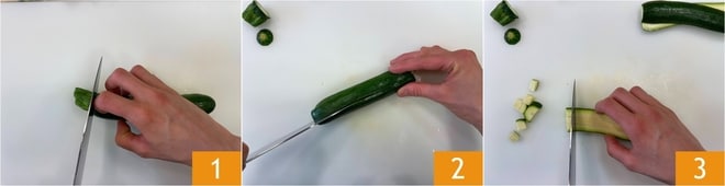 Pour préparer les pâtes aux courgettes et tomates cerises, commencez par bien laver les légumes. Coupez les extrémités des courgettes 1 et coupez-les d'abord en tranches 2 puis en cubes d'environ 1 cm 3.