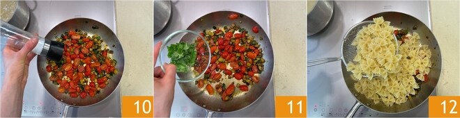 Quand les tomates cerises sont tendres, salez 10, poivrez et parfumez avec le basilic effeuillé à la main 11. Ajoutez ensuite les farfalle, égouttées al dente 12.
