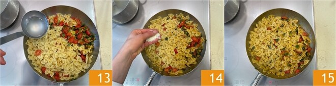 Ajoutez une louche d'eau de cuisson 13, le Pecorino râpé 14 et faites sauter le tout 15.