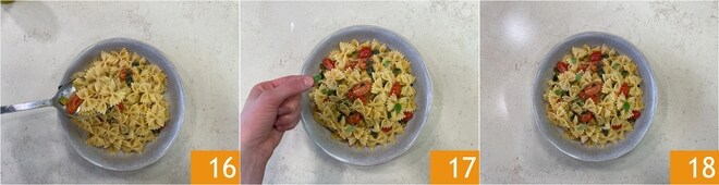 Dressez sur une assiette 16 et garnissez avec un tour de moulin à poivre noir et des feuilles de basilic 17. Vos pâtes aux courgettes et tomates cerises sont prêtes à être servies 18 !