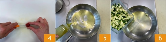 Lavez aussi les tomates cerises et coupez-les en deux 4. Dans une grande poêle, versez un filet d'huile généreux 5. Si vous préférez, vous pouvez également ajouter une gousse d'ail ou de l'oignon en tranches. Ajoutez ensuite les courgettes 6 et faites-les revenir pendant 5-7 minutes.