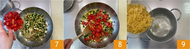 Ajoutez les tomates cerises 7, mélangez 8 et poursuivez la cuisson pendant encore 5-6 minutes. Pendant ce temps, faites cuire les pâtes dans une grande quantité d'eau bouillante, salée à votre convenance 9.