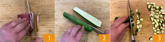 Pour préparer les pâtes aux courgettes, speck et gorgonzola, commencez par mettre sur le feu une casserole d'eau pour cuire les pâtes. Coupez le speck en fines lanières 1. Ôtez les extrémités des courgettes et coupez-les en deux dans le sens de la longueur 2, puis réduisez-les en dés 3.