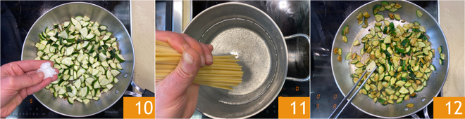 Salez 10 et faites cuire à feu moyen pendant une dizaine de minutes. Pendant ce temps, plongez les linguine dans l'eau bouillante salée 11. Une fois les courgettes cuites, retirez l'ail 12 et baissez le feu.