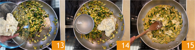Ajoutez le gorgonzola 13 et une louche d'eau de cuisson des pâtes 14. Mélangez pour faire fondre doucement le gorgonzola 15.