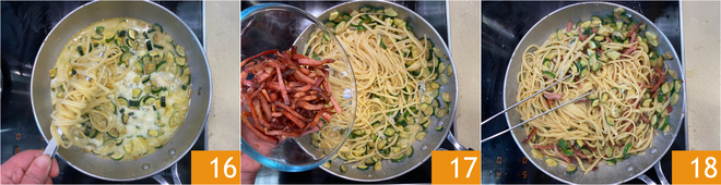 Égouttez les pâtes al dente et transférez-les dans la poêle 16, puis ajoutez le speck croustillant 17 et mélangez bien le tout 18.