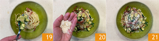 Dressez 19 et terminez avec du fromage râpé selon votre goût 20. Vos pâtes aux courgettes, speck et gorgonzola sont prêtes à être servies 21 !