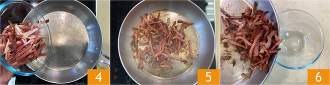 Mettez le speck dans une poêle bien chaude 4 et, sans ajouter de matière grasse, faites-le dorer à feu moyen pendant environ 5 minutes, jusqu'à ce qu'il devienne bien croustillant 5. Retirez le speck de la poêle et réservez-le 6.