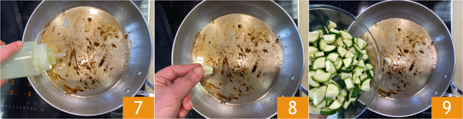 Dans la même poêle, versez un filet d'huile 7 avec une gousse d'ail 8, puis ajoutez les courgettes 9.