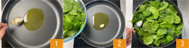 Pour préparer les pâtes aux épinards et taleggio, versez un filet d'huile dans une poêle et faites dorer une gousse d'ail en chemise pendant quelques minutes 1, puis ajoutez les épinards frais 2 et salez 3.
