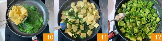 Égouttez les pâtes al dente directement dans la poêle avec le feu éteint 10, mélangez bien 11 et ajoutez le taleggio 12.