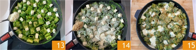 Saupoudrez de parmesan râpé 13 et de chapelure 14. Transférez le tout dans un plat (dans ce cas, nous avons utilisé une poêle pour la cuisson au four). Faites cuire en mode grill à puissance maximale pendant 5 minutes ou jusqu'à ce que la surface soit bien dorée 15. Vos pâtes aux épinards et taleggio sont prêtes à être servies!