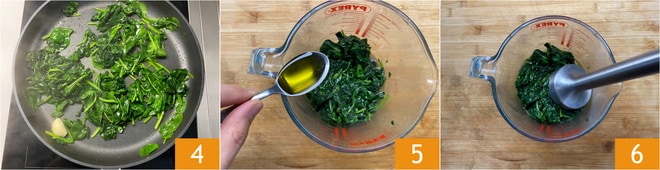 Laissez flétrir les épinards à feu moyen pendant environ 8 minutes 4. Une fois cuits, transférez le mélange dans un récipient, ajoutez l'huile 5 et mixez avec un mixeur plongeant 6.