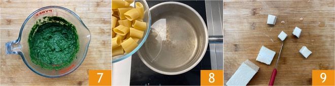 Vous devez obtenir une consistance homogène 7. Faites cuire les mezzi paccheri dans de l'eau bouillante salée 8, pendant ce temps, enlevez la croûte du taleggio et coupez-le en morceaux 9.