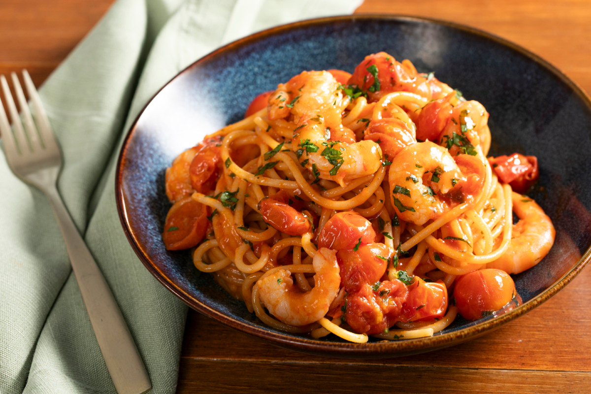 Les pâtes aux gambas sont un plat principal aussi simple qu'élégant : une recette spéciale à servir pour impressionner, que ce soit pour un déjeuner en famille ou un dîner romantique ! Les gambas, avec leur chair douce et délicate, se marient parfaitement avec la pulpe juteuse des tomates cerises et l'intensité du fond de cuisson extrait des carapaces, qui exalte au maximum la saveur de la mer en offrant un arôme riche et enveloppant. Facile à préparer mais impressionnant, les pâtes aux gambas ont tout pour être intégrées dans votre répertoire culinaire.