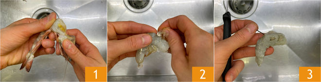 Pour préparer les pâtes aux gambas, commencez par nettoyer les crustacés : retirez la tête 1 et la carapace 2 et mettez-les de côté, puis enlevez l'intestin en faisant une incision sur le dos 3.