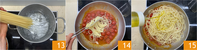 En attendant, faites cuire les pâtes dans une grande quantité d'eau salée 13. Égouttez-les al dente directement dans la poêle 14, puis ajoutez une louche d'eau de cuisson et un filet d'huile 15.
