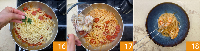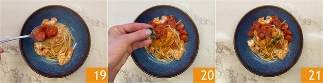 Ajoutez encore de la sauce 19 et du persil haché à votre goût 20. Vos pâtes aux gambas sont prêtes à être servies 21 !