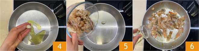 Dans une poêle, faites revenir un filet d'huile avec l'ail pendant quelques minutes 4, puis ajoutez les têtes et les carapaces des gambas 5. Faites bien dorer, puis déglacez avec le vin blanc 6.