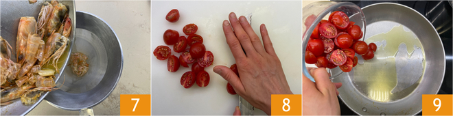 Lorsque toute la partie alcoolique s'est évaporée, filtrez le fond de cuisson à travers une passoire fine 7. Coupez les tomates cerises en deux 8 et mettez-les dans la même poêle avec un filet d'huile 9.