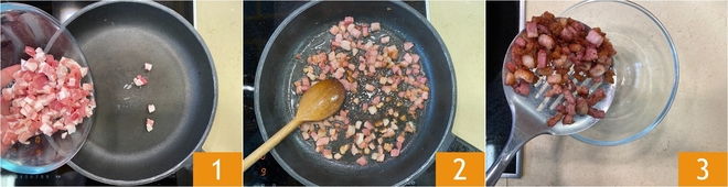 Pour préparer les pâtes aux poireaux, pecorino et pancetta, commencez par remplir une grande casserole d'eau salée et portez-la à ébullition. Pendant ce temps, dans une grande poêle, versez la pancetta coupée en dés 1 et laissez-la dorer sans ajouter de matières grasses 2 jusqu'à ce qu'elle soit dorée et croustillante. Égouttez-la ensuite pour enlever l'excès de graisse et transférez-la dans un petit bol 3. Réservez.