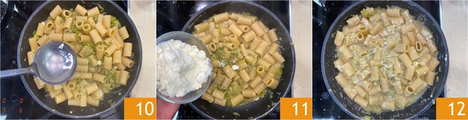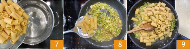 Faites cuire les pâtes 7 et égouttez-les al dente directement dans la poêle avec la sauce 8, faites-les sauter rapidement 9.