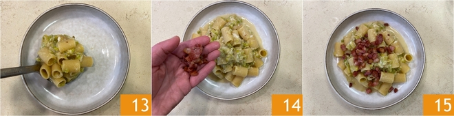 Dressez les assiettes 13, garnissez de la pancetta croustillante 14 et servez vos pâtes aux poireaux, pecorino et pancetta 15 !