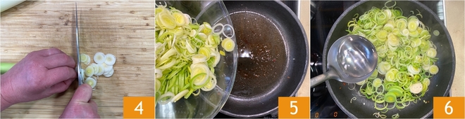 Nettoyez les poireaux en enlevant la partie la plus dure, puis émincez-les finement 4. Si nécessaire, versez un filet d'huile d'olive extra vierge dans la même poêle où vous avez cuit la pancetta, ajoutez les poireaux 5 et faites-les cuire à feu doux pendant environ 10 minutes, jusqu'à ce qu'ils soient tendres. Mouillez avec une petite louche d'eau de cuisson des pâtes pour faciliter la cuisson.