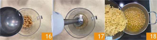 Prélevez une louche de pois chiches et versez-la dans un bocal, puis ajoutez une louche de l'eau que vous avez chauffée pour les pâtes 16 et mixez le tout avec un mixeur plongeant pour obtenir une crème 17. Maintenant, ajoutez les pâtes aux pois chiches 18.<\/p>