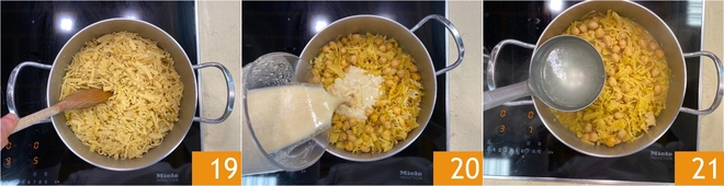 Mélangez 19 et incorporez également la crème de pois chiches 20. Arrosez avec une louche de l'eau que vous avez portée à ébullition pour cuire les pâtes 21.<\/p>