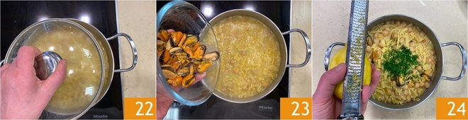 Couvrez avec le couvercle et cuisez les pâtes en ajoutant peu à peu l'eau, comme pour un risotto 22. Une minute avant la fin de la cuisson, ajoutez les moules décortiquées 23. Mélangez et retirez du feu : complétez avec du persil haché et le zeste de citron râpé 24.<\/p>