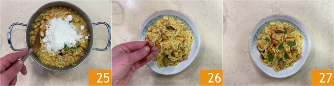 Incorporez le Pecorino râpé 25, mélangez bien et servez les pâtes aux pois chiches et moules bien chaudes avec du piment en poudre à volonté 26 et du persil frais 27.<\/p>