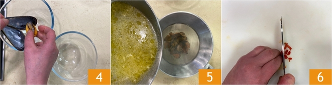 Une fois ouvertes, décortiquez-les 4. Filtrez l'eau de cuisson et versez-la sur les moules, pour qu'elles ne sèchent pas 5. Maintenant, hachez le piment frais 6.<\/p>