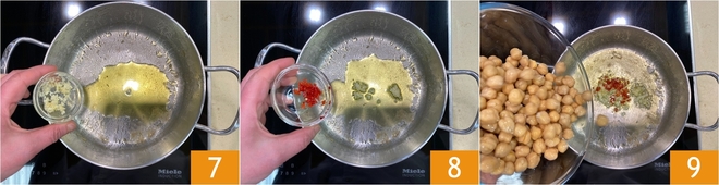 Dans la même casserole où vous avez cuit les moules, versez un autre filet d'huile, une gousse d'ail hachée 7 et le piment frais 8. Faites revenir pendant quelques minutes, puis ajoutez les pois chiches précuits 9 et faites-les brièvement revenir.<\/p>