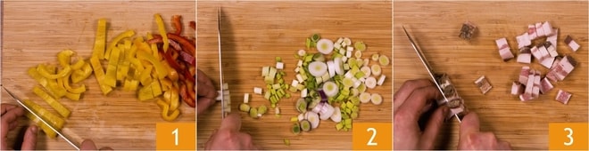 Pour réaliser les pâtes aux poivrons et pancetta, commencez par préparer les ingrédients : nettoyez les poivrons en enlevant le chapeau supérieur, les filaments et les graines internes, puis coupez-les en lanières pas trop fines 1. Nettoyez et émincez également les oignons nouveaux, y compris la partie verte 2. Enfin, découpez la pancetta en dés 3.