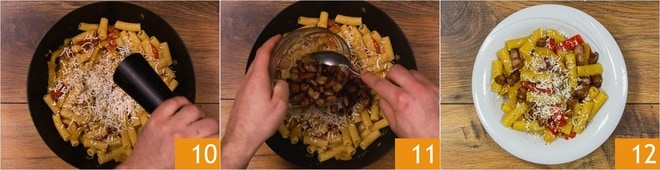 Retirez la poêle du feu, ajoutez la ricotta salée râpée et un tour de moulin à poivre 10, puis incorporez la pancetta mise de côté 11. Mélangez bien et servez vos pâtes aux poivrons et pancetta en ajoutant encore de la ricotta salée et du poivre à votre convenance 12 !
