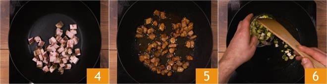 Chauffez une grande poêle et faites rissoler la pancetta à feu modéré 4. Lorsqu'elle est croustillante et dorée 5, retirez la pancetta et laissez la graisse dans la poêle. Ajoutez les oignons nouveaux 6 et faites-les revenir pendant quelques minutes, toujours à feu moyen.