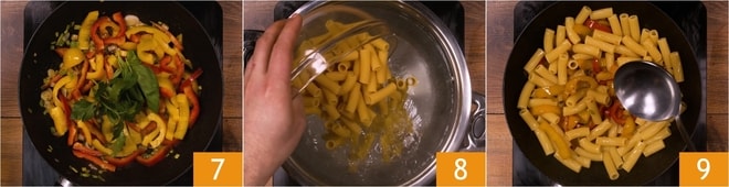 À ce stade, ajoutez également les poivrons avec les feuilles de persil et de basilic 7. Salez et faites cuire pendant 10-15 minutes en ajoutant un peu d'eau si nécessaire ; ils doivent être tendres. Pendant ce temps, portez à ébullition une casserole d'eau salée et faites cuire les pâtes très al dente 8. Égouttez les pâtes dans la poêle avec le condiment et versez une louche d'eau de cuisson 9, puis faites sauter le tout pendant une minute.