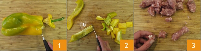 Pour préparer les pâtes avec poivrons, saucisse et feta, commençons par les légumes. Après avoir nettoyé l'intérieur des poivrons 1, coupez-les en morceaux irréguliers d'environ 3 cm 2. Cassez la saucisse avec les mains en morceaux d'environ 2 cm, après avoir retiré la peau, et passez aux fourneaux 3.