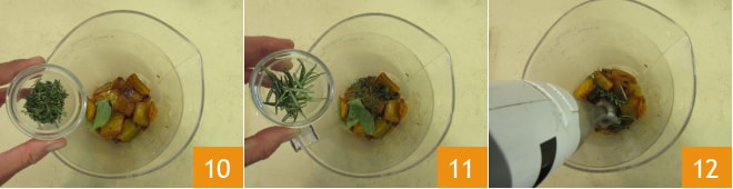 Parfumez avec de la sauge, du thym effeuillé 10, les brins de romarin 11 et commencez à mixer 12.