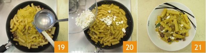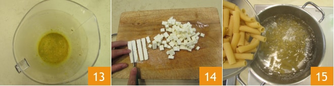 Obtenez une crème lisse et mettez de côté 13. Émiettez au couteau, ou même à la main pour un effet plus rustique, la feta 14 et retournez aux fourneaux. Plongez les rigatoni dans l'eau bouillante et salée et égouttez-les al dente 15.