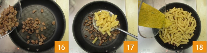 Versez de nouveau la saucisse dans la poêle, chauffez 16 et lorsque les pâtes seront cuites, égouttez-les directement dans le condiment 17. Ajoutez la crème de poivrons 18.