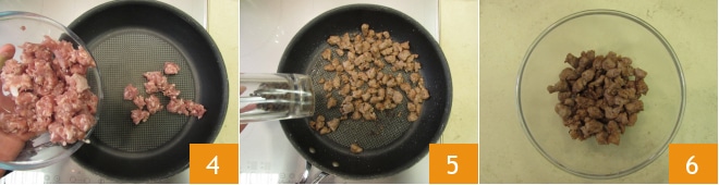Chauffez une poêle antiadhésive et ajoutez la saucisse 4, faites cuire à feu vif pendant environ 5 minutes, ajoutez une pincée de poivre 5 et lorsqu'elle sera bien colorée, mettez-la dans un bol 6.