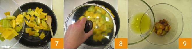 Dans la même poêle, versez les poivrons coupés 7, salez et couvrez avec le couvercle en laissant cuire environ 10 minutes à feu doux 8 ; la poêle nous servira de nouveau par la suite. Pendant ce temps, mettez à chauffer une casserole d'eau pour cuire les pâtes. Lorsque les poivrons seront cuits, transférez-les dans le bol d'un mixeur et ajoutez l'huile 9.