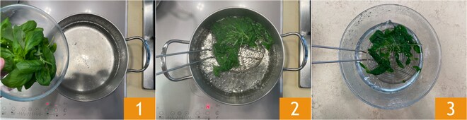 Pour préparer les pâtes au pesto de tomates séchées, ricotta et anchois, commencez par l'huile de basilic. Blanchissez le basilic dans de l'eau bouillante et salée pendant 2 secondes 1, puis égouttez-le dans un bol avec de l'eau glacée pour le refroidir tout en gardant sa couleur vive 3.