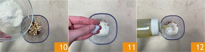 Ajoutez les noisettes, le Parmesan 10, l'eau, le sel 11, le poivre et l'huile 12.