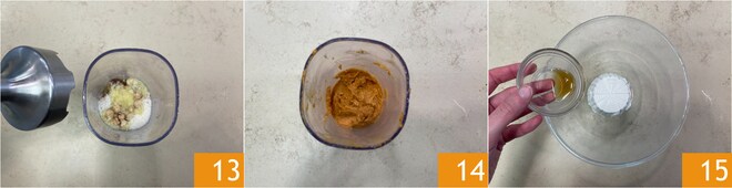 Mixez avec le mixeur plongeant 13 et, une fois homogène, mettez de côté 14. Dans un bol, mettez la ricotta et l'extrait d'anchois 15.