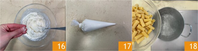 Assaisonnez avec une pincée de sel, mélangez 16 et transférez dans une poche à douille 17. Pendant ce temps, faites cuire les pâtes 18.