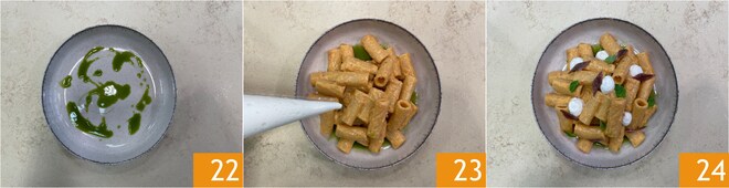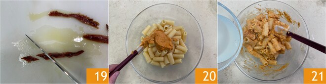 Coupez les anchois en petits losanges 19. Égouttez les pâtes en gardant un peu d'eau de cuisson et mettez-les dans un bol, assaisonnez avec le pesto 21 et ajustez la consistance avec l'eau de cuisson jusqu'à ce qu'elles soient bien crémeuses 21.