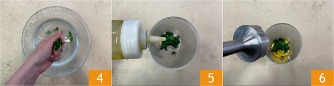 Pressez-le 4 et mettez-le dans un récipient haut avec de l'huile et de l'eau froide 5. Mixez avec le mixeur plongeant 6.